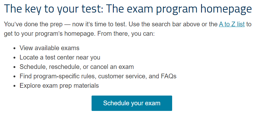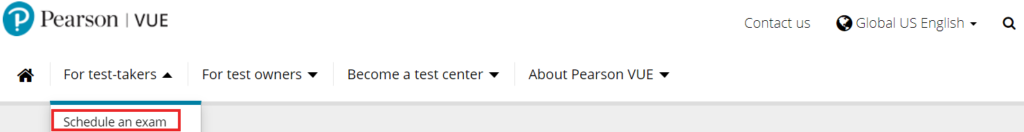 From the homepage select Schedule an exam from the for test-takers dropdown.